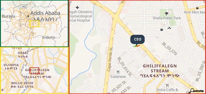 Map showing the address of CEO in three different zoom levels.