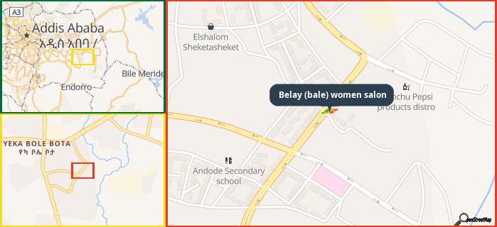 Map showing the address of Belay (bale) women salon in three different zoom levels.