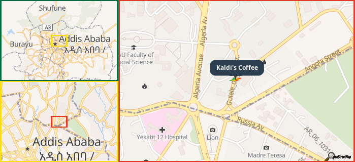 Map showing the address of Kaldi's Coffee in three different zoom levels.