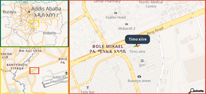 Map showing the address of Timo xiire in three different zoom levels.