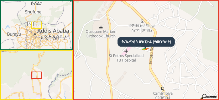 Map showing the address of ቅ/ጴጥሮስ ሆስፒታል (የመንግስት) in three different zoom levels.