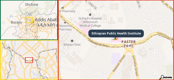 Map showing the address of Ethiopian Public Health Institute in three different zoom levels.