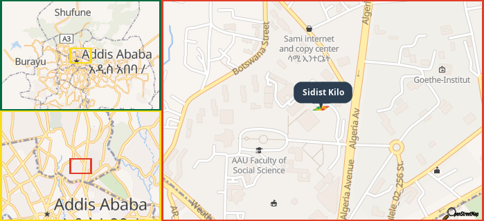 Map showing the address of Sidist Kilo in three different zoom levels.