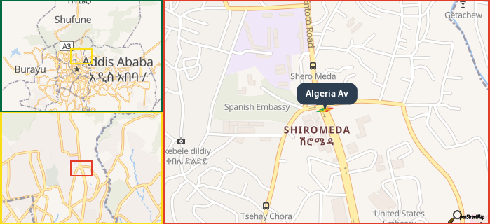 Map showing the address of Algeria Av in three different zoom levels.