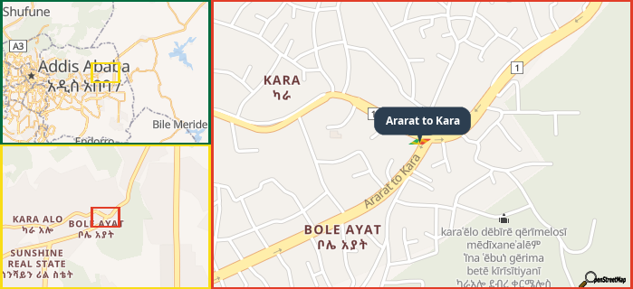 Map showing the address of Ararat to Kara in three different zoom levels.