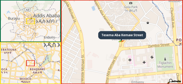 Map showing the address of Tesema Aba Kemaw Street in three different zoom levels.