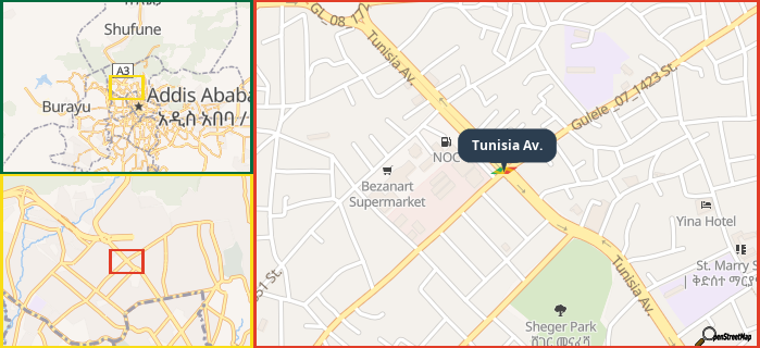 Map showing the address of Tunisia Av. in three different zoom levels.