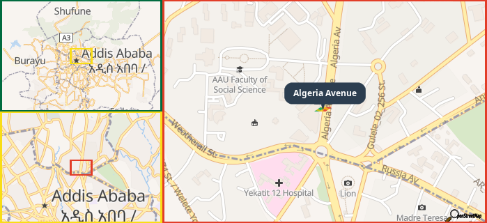 Map showing the address of Algeria Avenue in three different zoom levels.