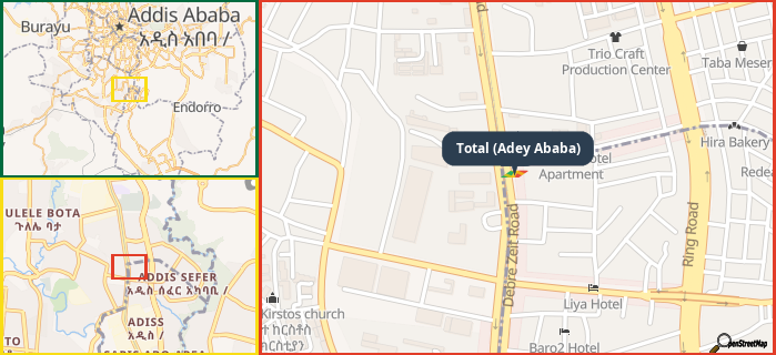 Map showing the address of Total (Adey Ababa) in three different zoom levels.