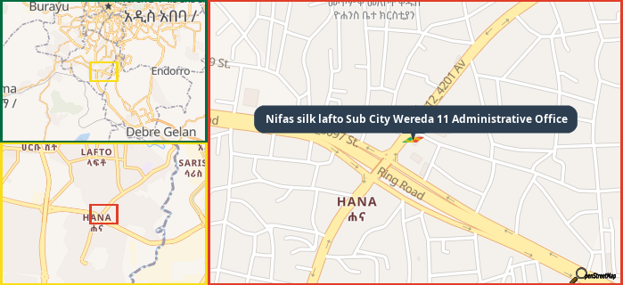 Map showing the address of Nifas silk lafto Sub City Wereda 11 Administrative Office in three different zoom levels.