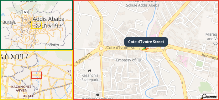 Map showing the address of Cote d'Ivoire Street in three different zoom levels.