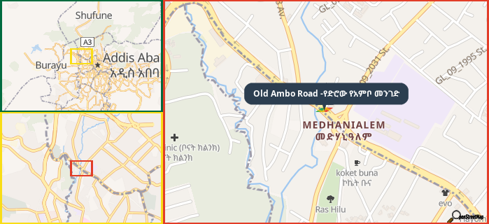 Map showing the address of Old Ambo Road -የድሮው የአምቦ መንገድ in three different zoom levels.