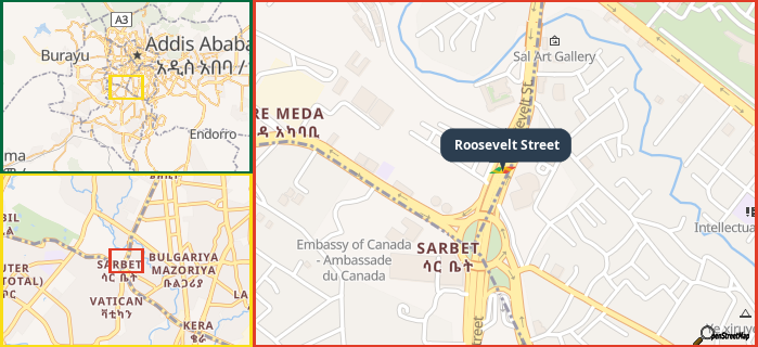 Map showing the address of Roosevelt Street in three different zoom levels.