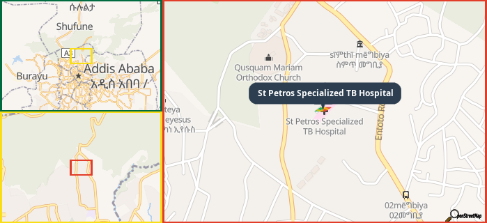 Map showing the address of St Petros Specialized TB Hospital in three different zoom levels.
