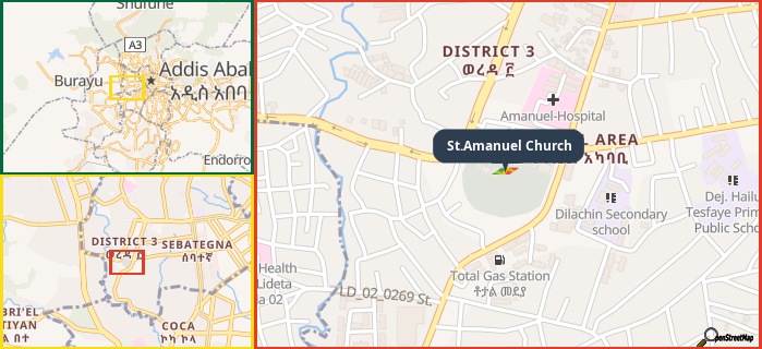 Map showing the address of St.Amanuel Church in three different zoom levels.
