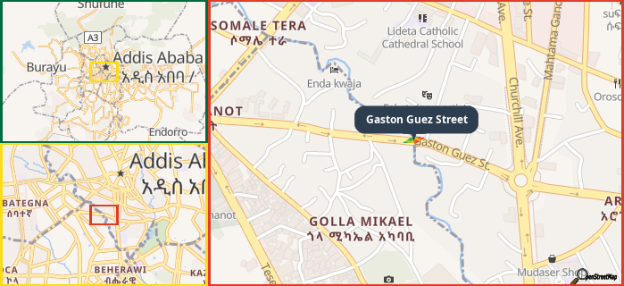 Map showing the address of Gaston Guez Street in three different zoom levels.