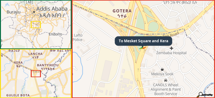 Map showing the address of To Mesket Square and Kera in three different zoom levels.
