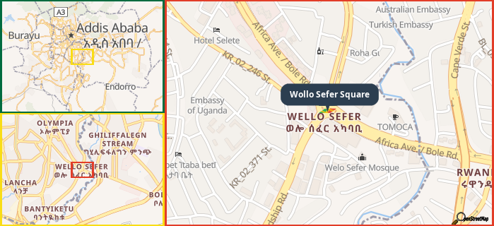 Map showing the address of Wollo Sefer Square in three different zoom levels.